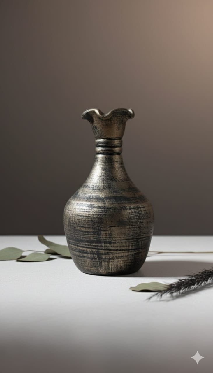 This sculptural vase features a softly rounded body paired with an elegant, fluted neck that adds subtle character. Its dark, earthy finish is layered with natural variations, giving the surface a rich, textured depth that feels handcrafted and one of a kind. The balanced proportions and refined silhouette make it a striking accent on its own, while its warm, organic tones bring a cozy, grounded feel to any interior. 🖊️ This handmade products are totally made by the rural artisans for that maybe little imperfections will be there 🙏 . We use 100%natural clay as the raw material.👉🏻Easy to clean No need to use soap / detergent to wash the clayware.