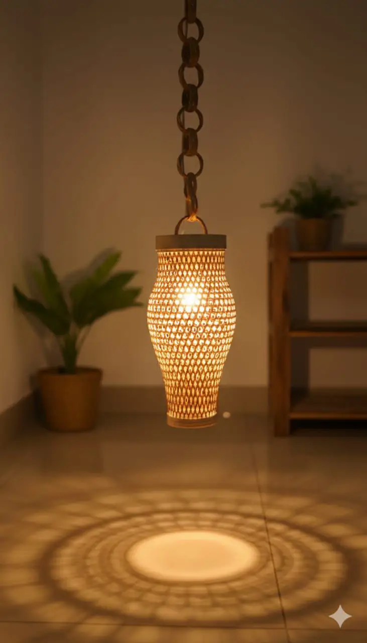 This handcrafted pendant light features a slender, woven shade that creates a warm, focused glow with beautifully patterned shadows. Suspended from a classic chain, its elongated silhouette adds elegance and visual interest without overwhelming the space. The intricate weave highlights artisanal craftsmanship while softly diffusing light for a cozy, ambient feel. Perfect for hallways, reading nooks, or bedside spaces, this pendant brings warmth, texture, and a calm, inviting atmosphere to your home.