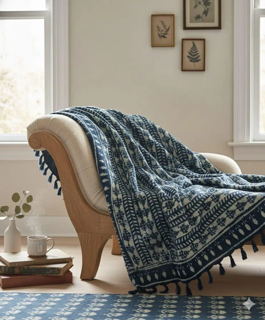 Signature Tassel Finish: Edged with thick, hand-knotted indigo tassels that add a tactile, bohemian quality to the throw’s drape.