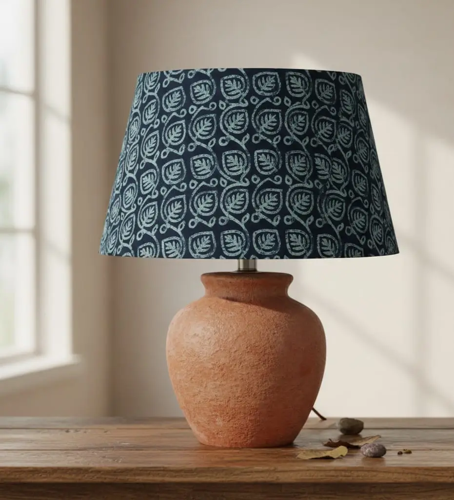 Elevate your interior lighting with our Botanical Block-Print Lampshade. Featuring a deep indigo canvas adorned with a delicate, hand-stamped leaf motif, this shade brings a touch of traditional craftsmanship to the modern home. The textured fabric provides a soft, diffused glow that enhances the ambiance of any room, from a quiet study to a cozy bedside.