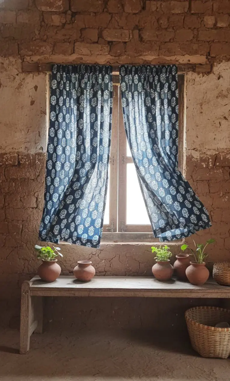 Crafted from lightweight, breathable cotton, the fabric gently filters sunlight to create a soft, airy glow while maintaining privacy. The timeless handblock pattern pairs beautifully with earthy interiors, wooden accents, and neutral palettes — perfect for creating a cozy, welcoming atmosphere.
