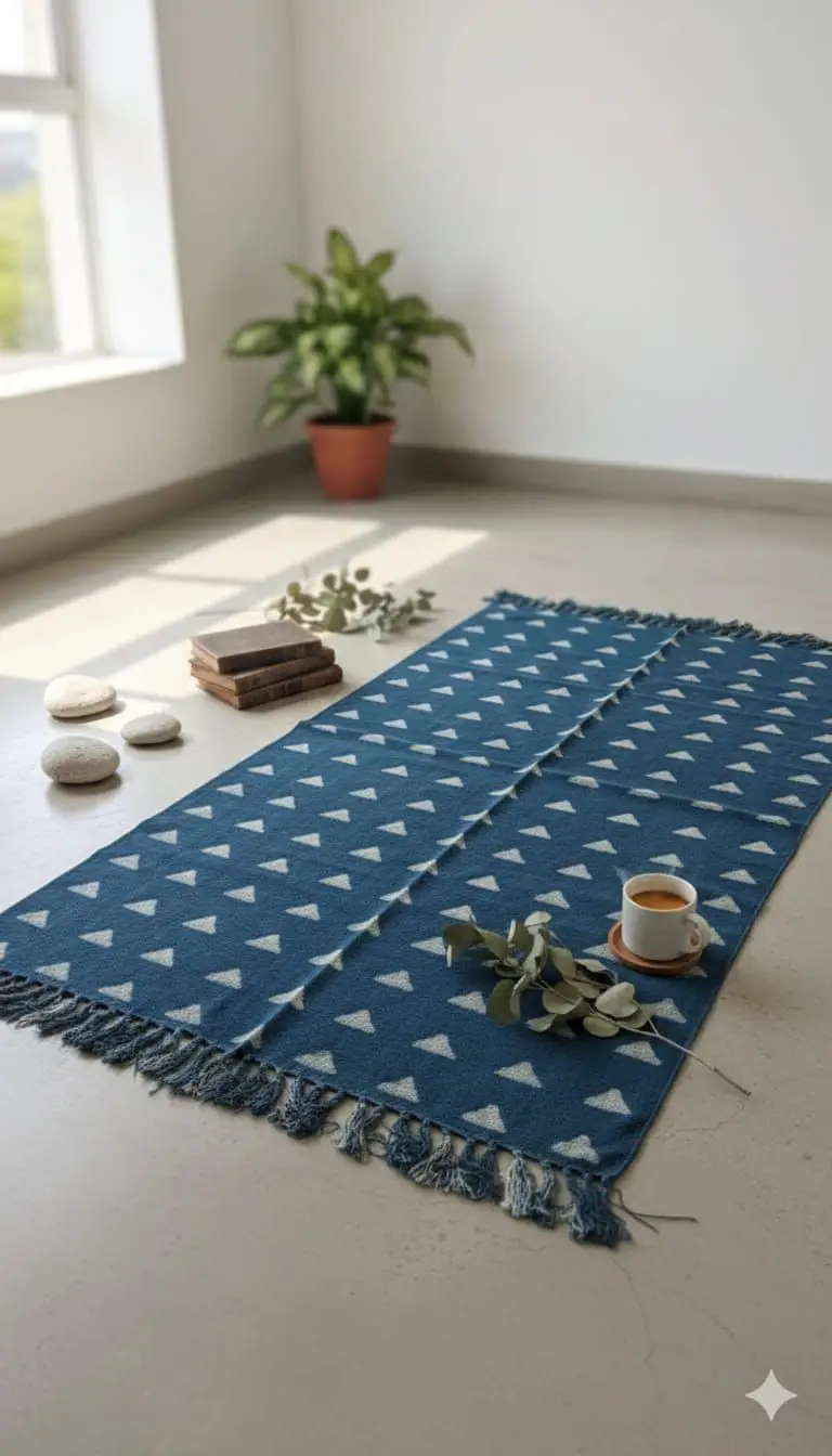 “The Indigo Peak Runner is the perfect ‘reset’ for a room. Its structured pattern balances out organic floral drapes, bringing a sense of modern intentionality to your bohemian sanctuary.”