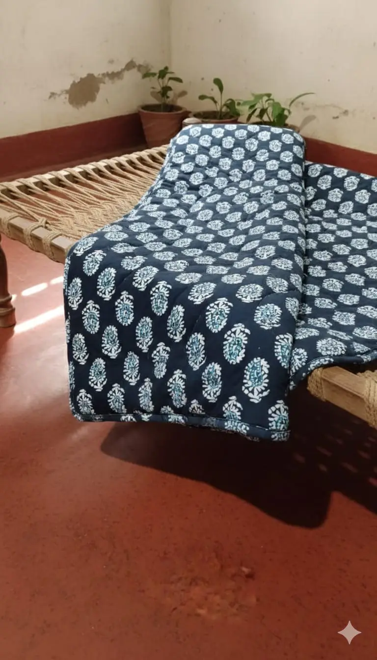 Perfect for use on a bed, daybed, or traditional charpai, this versatile quilt blends beautifully with modern, rustic, bohemian, and heritage interiors. Each piece is individually handmade, making every quilt subtly unique in character and finish.