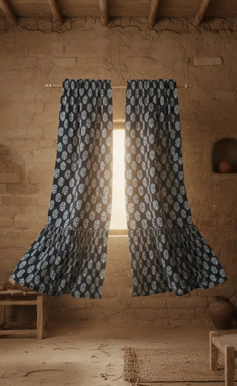 Midnight Indigo Floral Block Print Curtains – Heritage Bloom Collection height 5.5ft Length 4ft