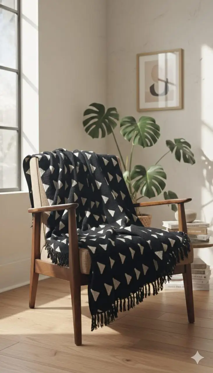 “The Midnight Triangle Throw is the ultimate ‘style-shifter.’ It brings a sharp, modern edge to soft, bohemian spaces and provides a cozy, tactile layer to stark, minimalist interiors.”