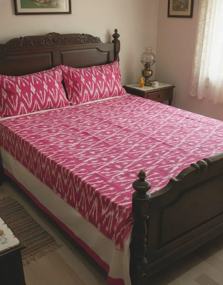 Transform your bedroom into a vibrant sanctuary with our Magenta Ikat Heritage Bedding Set. This striking ensemble features a bold, rhythmic Ikat pattern in a deep magenta hue, offering a sophisticated blend of traditional textile art and modern color. Designed to be the centerpiece of any room, the set provides a rich, visual energy that pairs beautifully with both antique wood frames and clean, contemporary furniture.