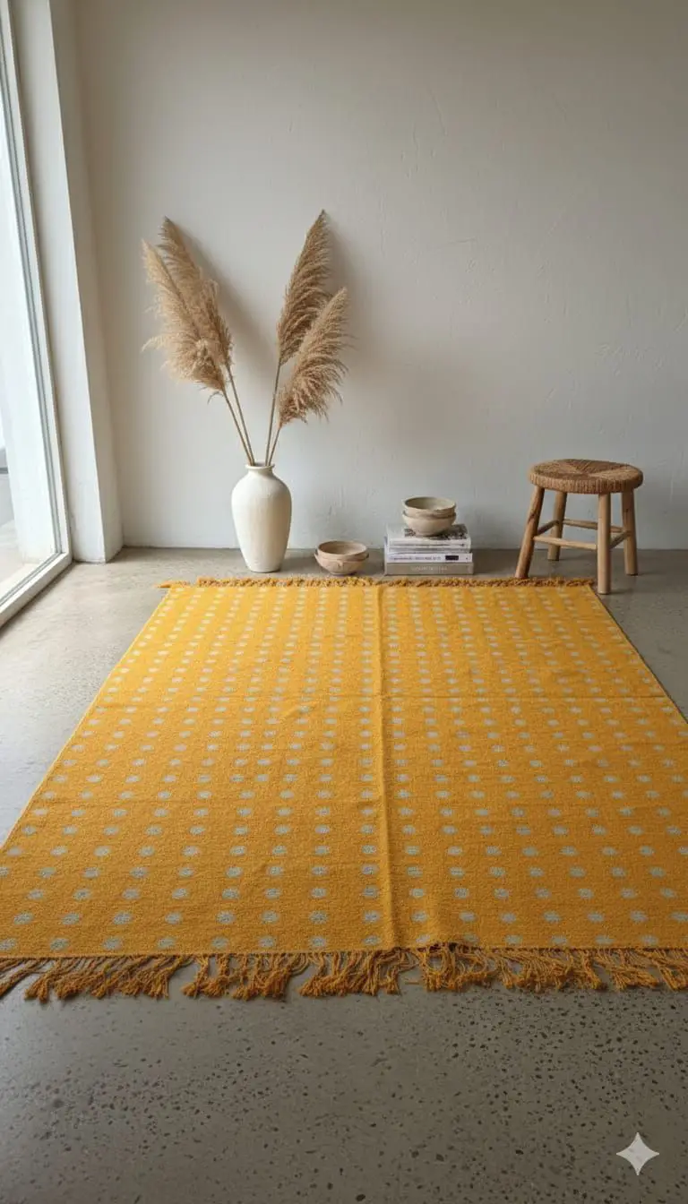 “The Saffron Sun Rug is the ultimate companion to our golden floral curtains. To create a professional, curated look, pair it with natural textures like rattan stools, dried pampas grass, and ceramic pottery.”