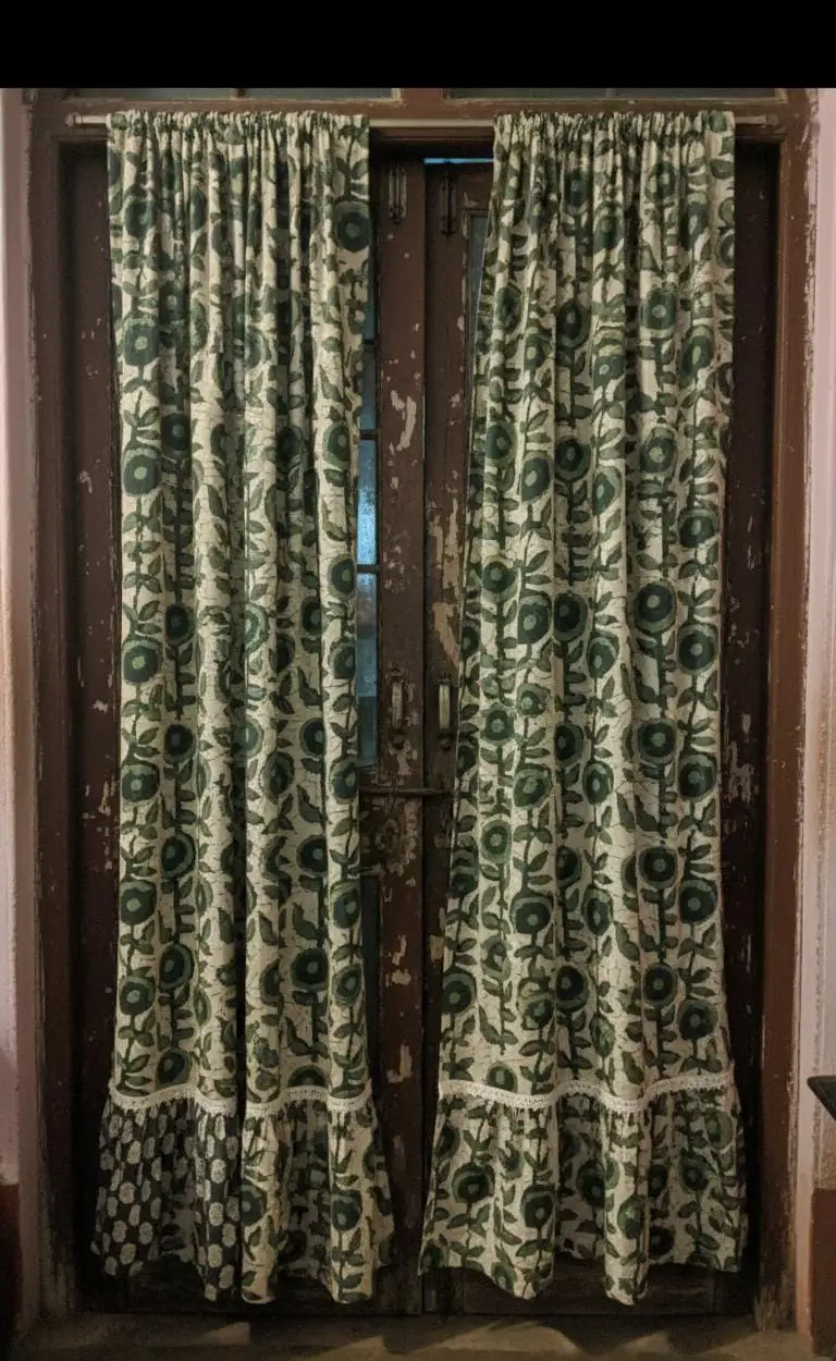Add a layer of natural elegance to your home with our Sage Botanical Door Curtains. Designed to bring the outdoors in, these curtains feature a sophisticated block-print style pattern of stylized floral motifs in calming shades of olive and forest green. The warm cream background ensures a bright yet cozy feel, making them a perfect addition to any living room, bedroom, or entryway.