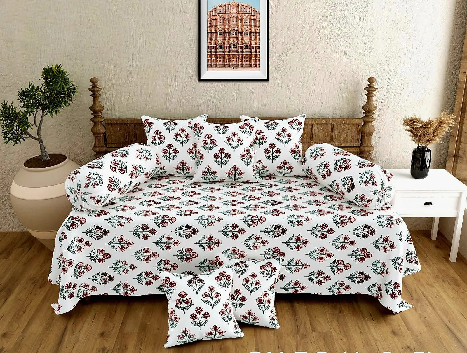 Add a graceful charm to your home with Cozyco’s classic floral cotton diwan set. Featuring intricate red and green floral motifs on a soft white base, this set creates a refreshing and elegant look. Perfect for everyday comfort and festive gatherings, it enhances your living space with timeless style.