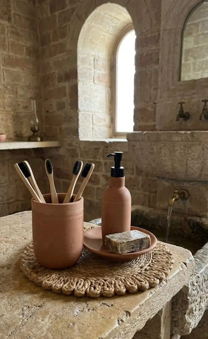 The “All-in-One” Plate: Our shallow terracotta dish acts as a landing pad for the dispenser or a bar of soap, keeping moisture contained and your surfaces tidy.