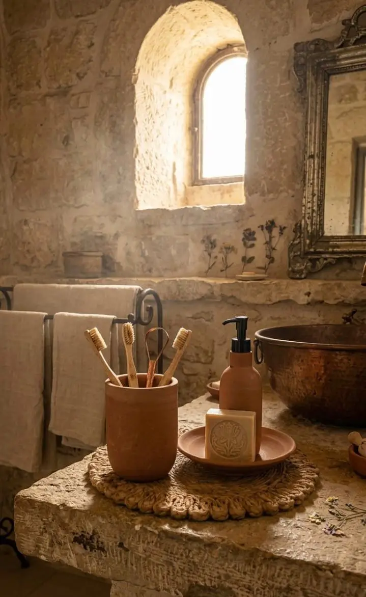 Tactile Warmth: The earthy, sun-baked clay softens the harsh lines and “cold” feel often found in smaller, tiled bathrooms.