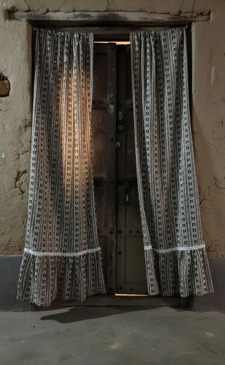Infuse your home with rustic charm using our Vintage Stripe & Lace Door Curtains. These panels feature a sophisticated vertical pattern of intricate geometric and floral stripes in a muted earth-tone palette. The detailed design provides a timeless, traditional look that complements farmhouse, bohemian, or heritage-inspired interiors.